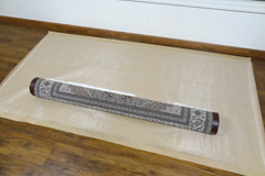 STEP3 丸めたじゅうたんを包装紙の上に乗せます