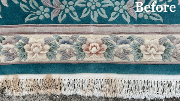 A様よりクリーニングをご希望の中国緞通を配送業者経由で弊社まで送っていただき、まずは入念に状態をチェック。今回はクリーニングと房糸の染み取り作業の実績をご紹介いたします。